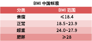 BMI = 體重(kg) ÷ 身高(m)的平方,一般來(lái)說(shuō),按照中國(guó)標(biāo)準(zhǔn),BMI18.5~23.9為正常體重,24.0~27.9則超重,≥28.0肥胖。