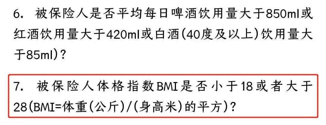 在重疾險(xiǎn)或醫(yī)療險(xiǎn)的【健康告知】中,會(huì)有涉及體重BMI的問(wèn)題,如果不符合標(biāo)準(zhǔn)就要進(jìn)入核保環(huán)節(jié)。面臨保費(fèi)增加或直接拒保的結(jié)果。