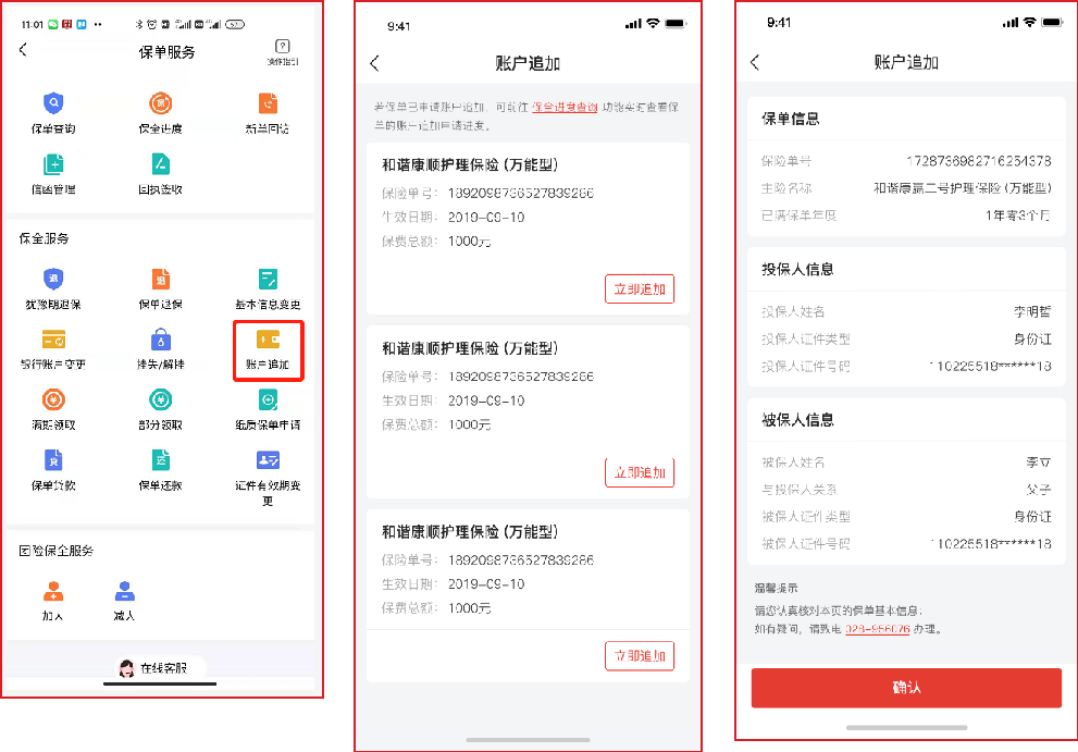 選擇要追加的保單,填寫(xiě)追加信息,完成身份證和手持身份證上傳,待審核通過(guò)即可完成賬戶追加。