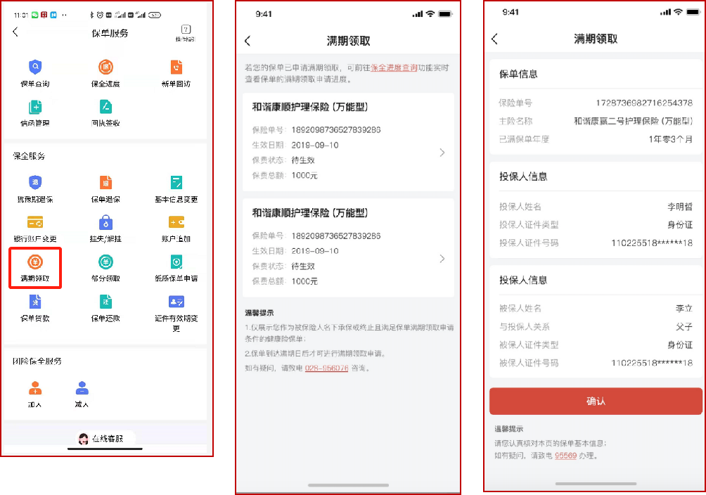 萬(wàn)能型保險(xiǎn)產(chǎn)品支持滿期領(lǐng)取,APP可展示滿足滿期領(lǐng)取條件的保單列表,可以在線申請(qǐng)滿期領(lǐng)取。點(diǎn)擊滿期領(lǐng)取保單,上傳身份信息后,填寫(xiě)滿期領(lǐng)取金額,完成手機(jī)號(hào)驗(yàn)證,待身份信息審核通過(guò),即可完成滿期領(lǐng)取。